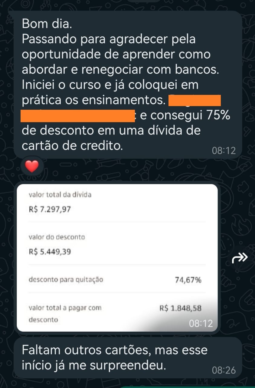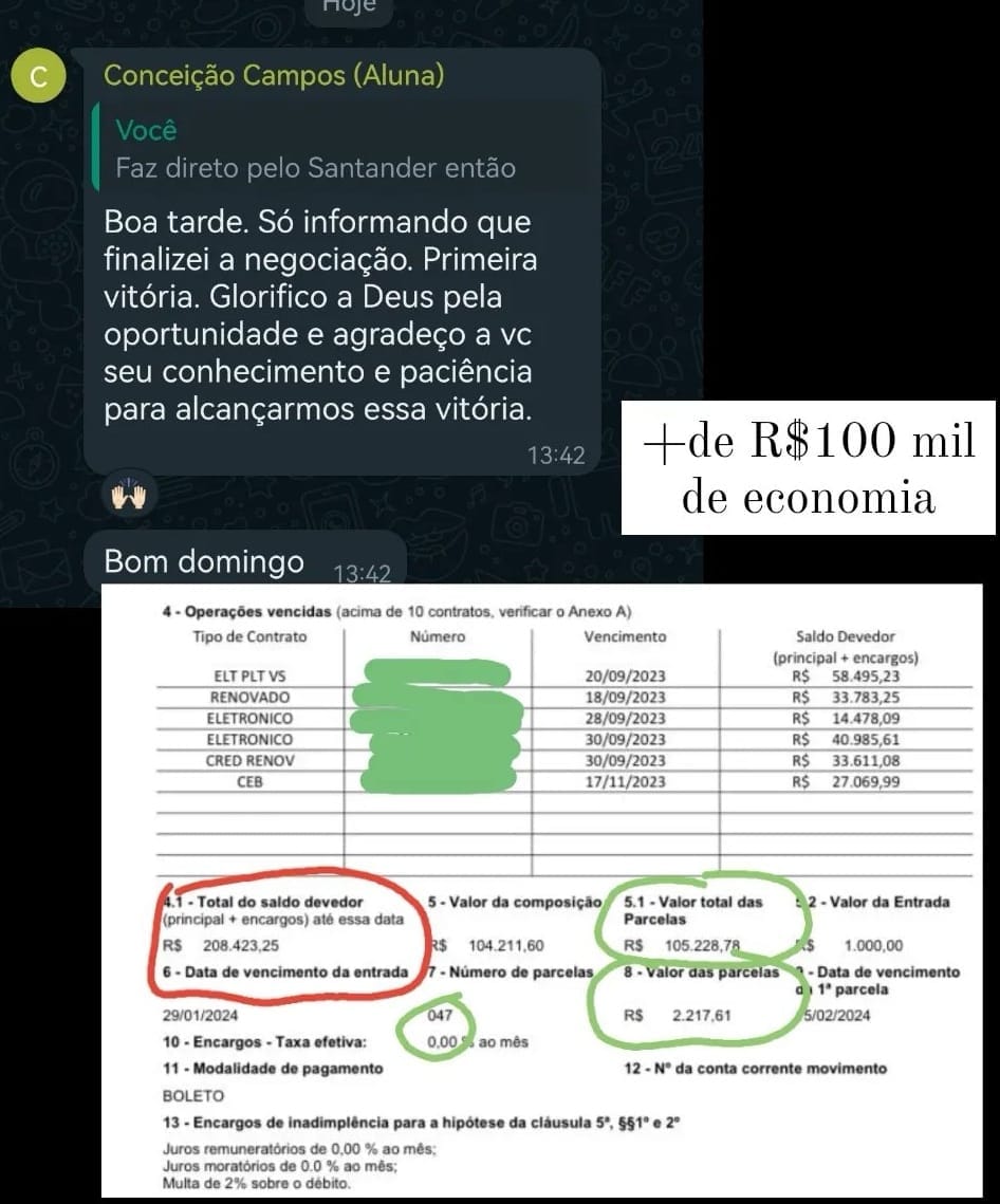 Ao invés de você despachar um processo e torcer para dar tudo certo, você terá em mãos estratégias secretas que eu venho aplicando nos últimos 5 anos com os meus clientes e alunos para conseguir negociações com reduções absurdas de juros de forma extrajudicial.