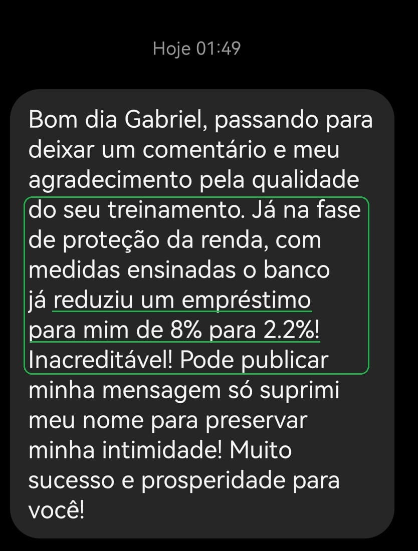 Também foi nessa época que precisei “pensar fora da caixa”. Enquanto todo mundo estava falando em fazer renda extra e cortar gastos, eu decidi entender como funcionava o nosso sistema bancário e me epecializei em endividamento. Foi a partir disso que em apenas 1 ano eu consegui me livrar de todas as dívidas sem pagar 1 centavo de juros.